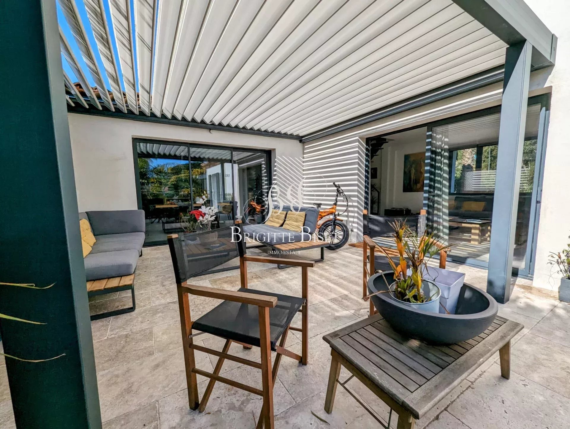Elle vous propose avec ses belles prestations dans un petit domaine fermé: une entrée avec séjour donnant sur une grande baie vitrée allant sur la terrasse couverte avec store bioclimatique.